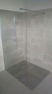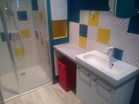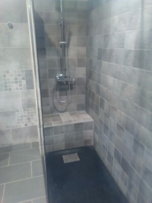 Fin des travaux transformation d’une chambre simple en suite parentale, douche italienne, robinetterie encastrable, lavabo ..